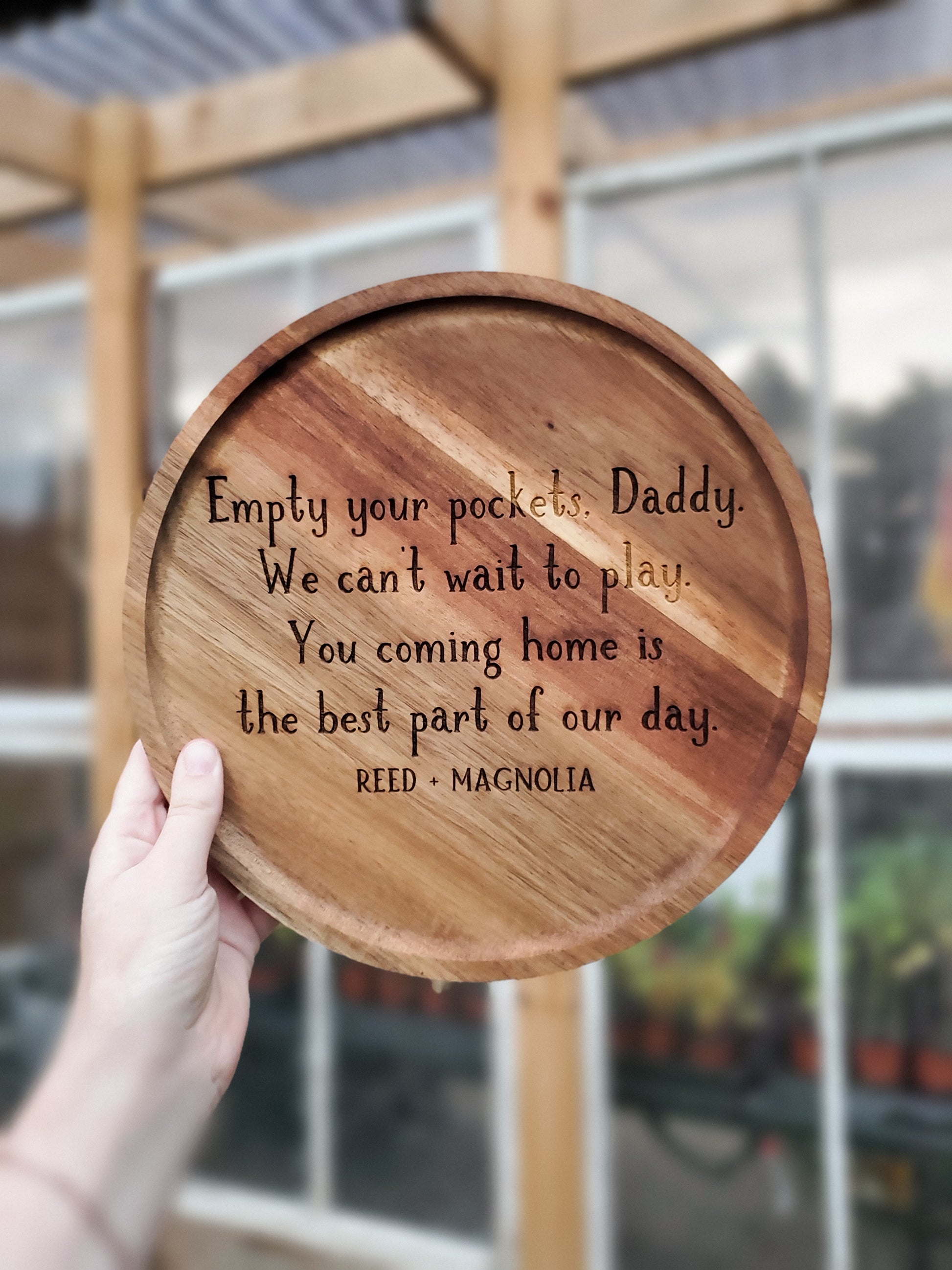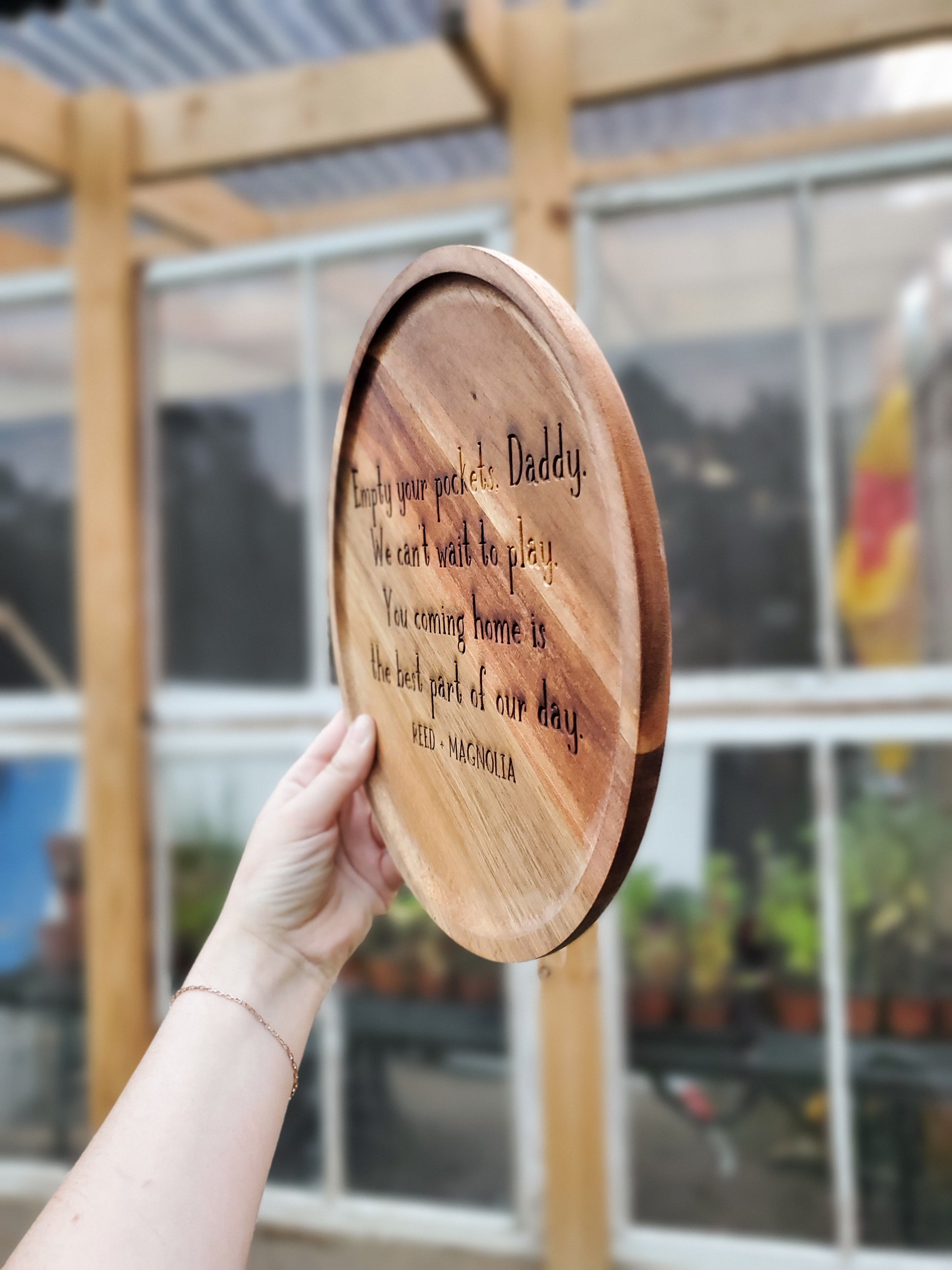 Please only include the names you'd like engraved onto the tray, as the font and phrase are not customizable. I can fit several names at the bottom.